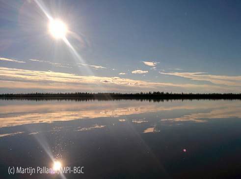 After my colleagues left to continue with maintenance work around the Chersky observation sites, I stayed for half a week to finish additional calibration experiments with the existing system, and prepare for next year, when we will install an automatic flask sampler. With this flask sampler we aim to monitor more greenhouse gas species and isotopes. These measurements will allow us to better understand sources and sinks of greenhouse gases in the region. When it was time to go back to Ambarchik the weather did not agree, and even the day after the white-capped waves in Ambarchik Bay were a clear sign that no boat would be coming. At least this gave me some time to have a walk through the remains of the gulag and over the tundra. Later in the afternoon, to my surprise, Nikita arrived at the station to pick me up. Apparently there was no wind whatsoever on the Kolyma, but the waves at sea were so high he had to leave the boat in the bay before ours and walk the rest of the way over the tundra. Getting back to the boat was interesting—Dima, the meteorologist at Ambarchik, brought us on a snowmobile, even though the tundra was absolutely snow free at that time. The trip back by boat was possibly more beautiful than the way there, with the river as flat and clear as a mirror.
